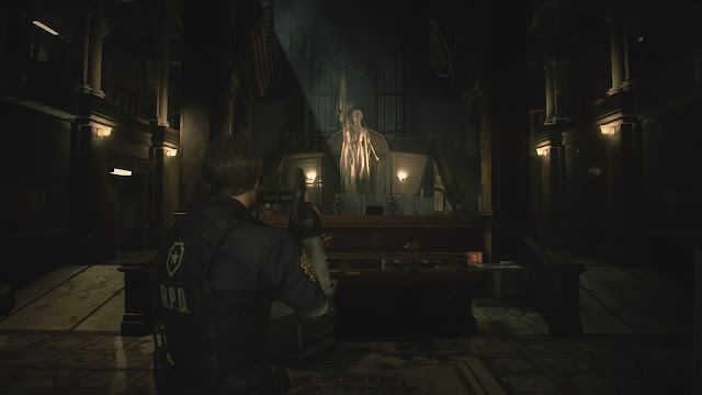 O cenário da delegacia é extremamente detalhado, refletindo bem o terror causado pelas criaturas carnífices. A escuridão dos ambientes atua como se fosse uma personagem, mantendo os perigos ocultos, exigindo presença quase constante da lanterna empunhada com uma arma e enaltecendo a vulnerabilidade de Leon.