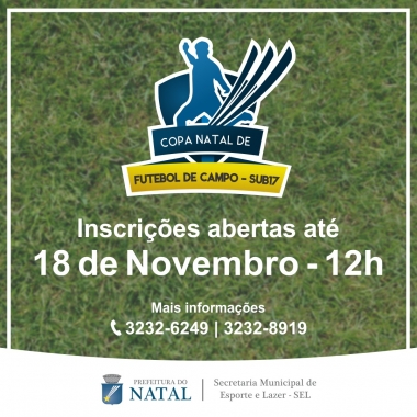 A prefeitura do Natal, através da Secretaria Municipal de Esporte e Lazer (SEL), realizará a Copa Natal de Futebol de Campo Sub-17 Masculino, com data a ser divulgada nos próximos dias. As inscrições já estão abertas e podem ser efetuadas até o dia 18 de novembro, às 12h, no Setor de Desporto, no Palácio dos Esportes. Vale destacar que a competição tem um limite de 32 times inscritos.