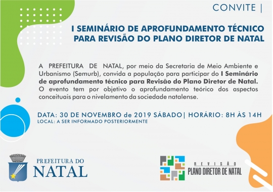 A Prefeitura de Natal convida a população natalense para participar no próximo dia 30 de novembro, do I Seminário de Aprofundamento Técnico para Revisão do Plano Diretor de Natal, que tem por objetivo o aprofundamento teórico dos aspectos conceituais do Plano para um maior nivelamento da sociedade natalense.