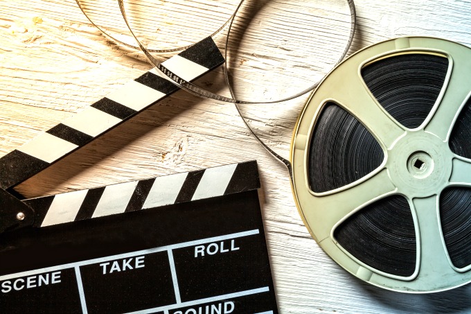 Film camera chalkboard and roll on wooden table