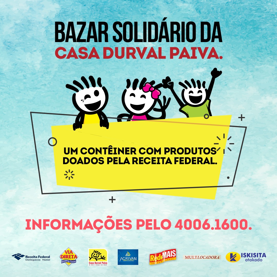 9. O objetivo do Bazar é arrecadar fundos para as atividades da Casa de Apoio à Criança com Câncer Durval Paiva, e foi possibilitado graças ao apoio da Delegacia da Receita Federal do Rio Grande do Norte.