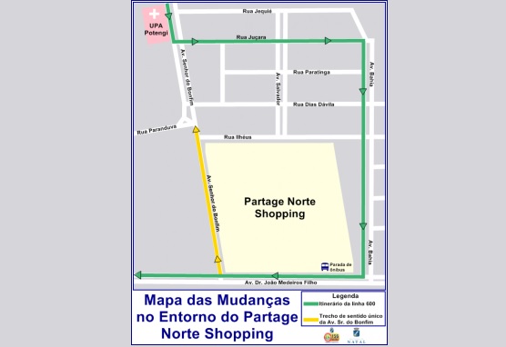 A Prefeitura do Natal, por meio da Secretaria de Mobilidade Urbana (STTU), informa que, devido as obras de expansão do Partage Norte Shopping, a Av. Senhor do Bonfim vai passar a operar apenas no sentido Soledade no trecho entre a Av. Dr. João Medeiros Filho e Rua Paranduva a partir de terça-feira (07/01).