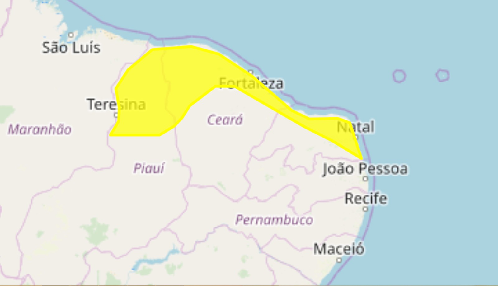 O alerta aponta para a ocorrência de chuvas com volume de 20 e 30 milímetros por hora ou até 50 mm/dia, ventos intensos de 40 a 60 km/h. Municípios do Piauí e do Ceará também foram listados no alerta.