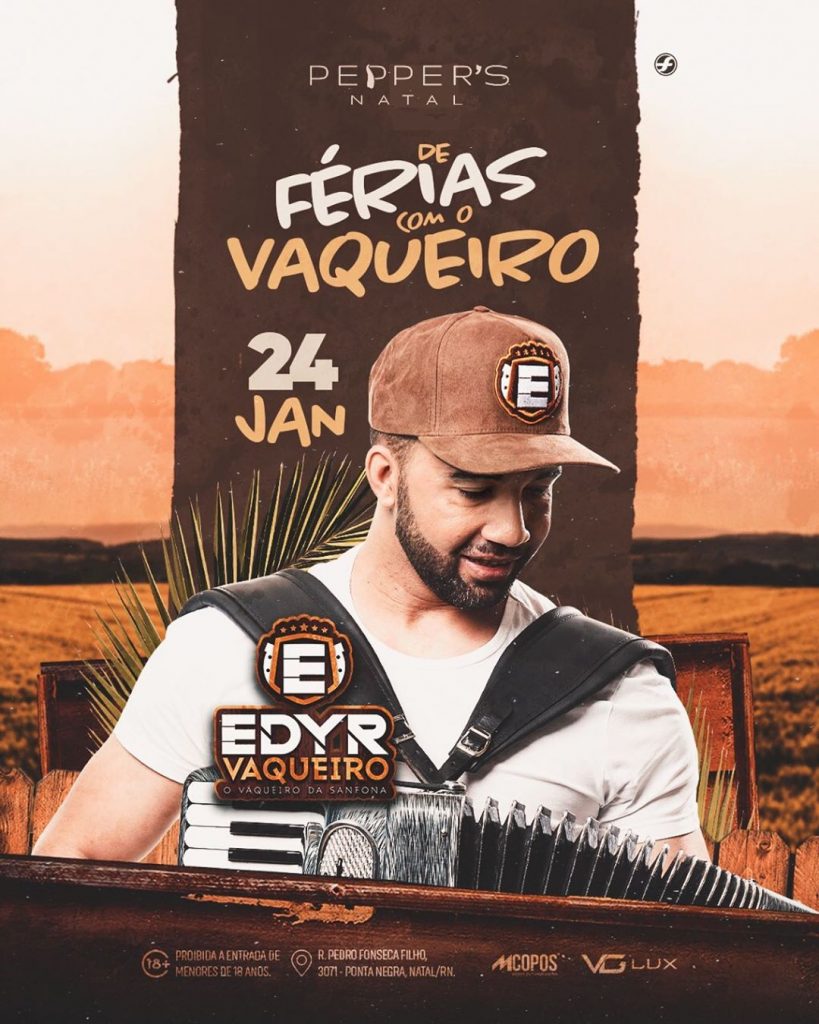 O mês de janeiro está animado na Pepper´s Natal. A casa mais balada da cidade preparou mais uma super programação para não deixar ninguém parado neste fim de semana. O agito começa na sexta-feira, dia 24, com a festa “De Férias com o Vaqueiro”. O sanfoneiro Edyr Vaqueiro e o cantor Fabinho Fernandes são os escalados da noite. Mulheres terão entrada gratuita até meia noite.