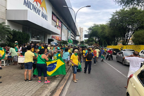 Vestidos com camisas verde e amarela, principalmente da seleção de futebol, as pessoas mobilizadas empunham cartazes onde se lê “Fechamento do STF” e acompanham o Hino Nacional executado por um carro de som que mantém o grupo mobilizado.