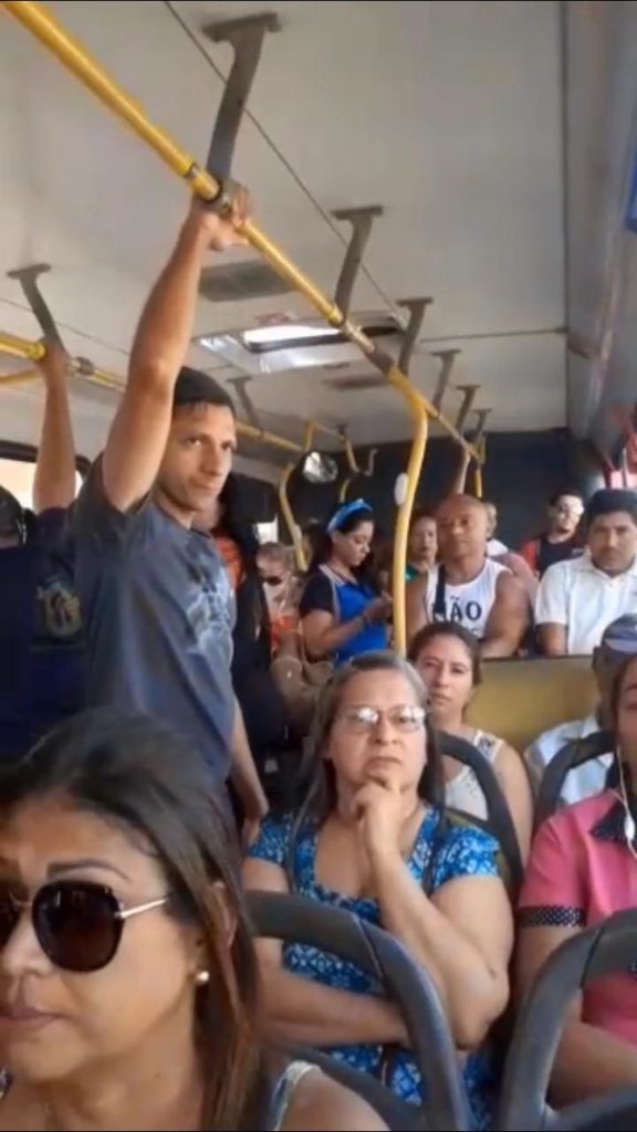 No primeiro dia após a redução da frota de ônibus em Natal, os veículos rodaram cheios pela cidade. Nesta segunda-feira (23), apesar dos avisos de que os coletivos só transportariam passageiros sentados, havia gente em pé, aglomerada nos corredores dos ônibus. As lotações foram registradas pelos usuários.