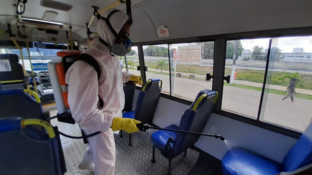 Uma ação conjunta entre as Secretarias de Limpeza Urbana (Selim) e de Segurança, Mobilidade Urbana e Defesa Social (Sesdem) realizou, na manhã deste domingo (5) a desinfecção dos transportes alternativos interbairros, além das viaturas do 3º Batalhão da Polícia Militar, da Guarda Municipal e do trânsito.