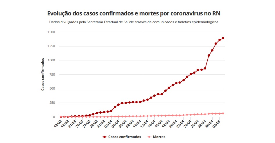 O Rio Grande do Norte chegou neste domingo (3) a 1.392 casos confirmados de Covid-19 e 61 óbitos provocados pela doença. Os números foram divulgados pela Secretaria Estadual de Saúde Pública (Sesap). O estado conta ainda com 4.939 casos suspeitos, 4.378 descartados e 415 recuperados.