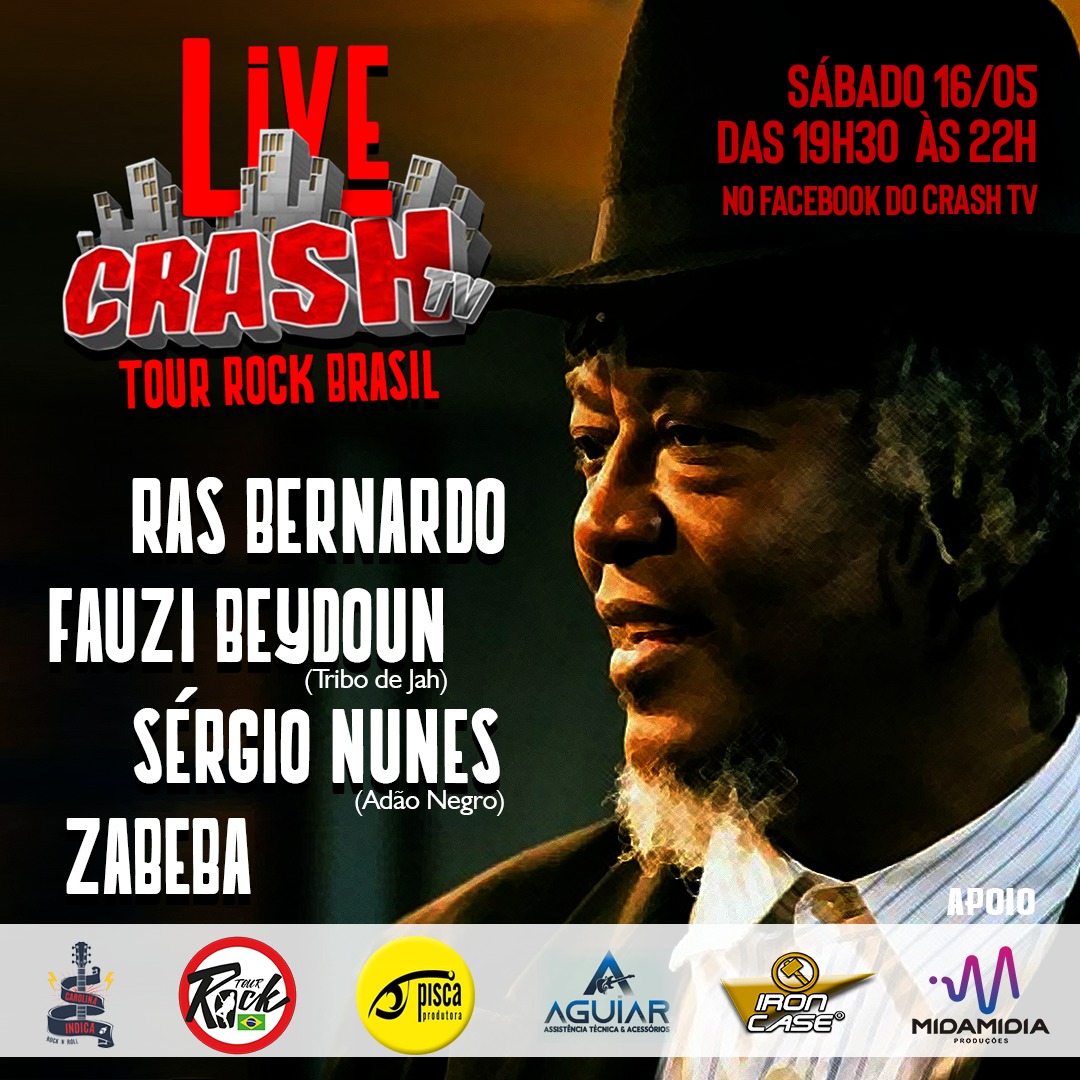 Neste sábado, 16/05, das 19:30h às 22h, pelo facebook do Crash TV, acontecerá a Live Crash TV – Especial Ras Bernardo, uma live em prol de Ras Bernardo, que foi o primeiro vocalista da banda Cidade Negra, e contará com a presença de: Fauzi Beydoun (Tribo de Jah), Zabeba (autoral), Sérgio Nunes (Adão Negro) e Ras Bernardo.