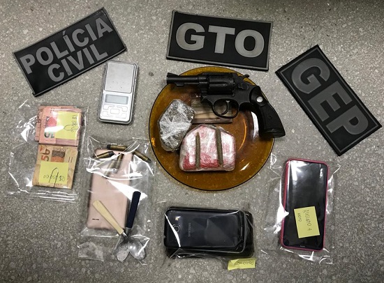 No decorrer da ação, os policiais apreenderam uma quantia em dinheiro fracionado, três aparelhos celulares, dois tabletes de maconha, um revólver calibre 38, munições, uma balança de precisão e duas colheres.