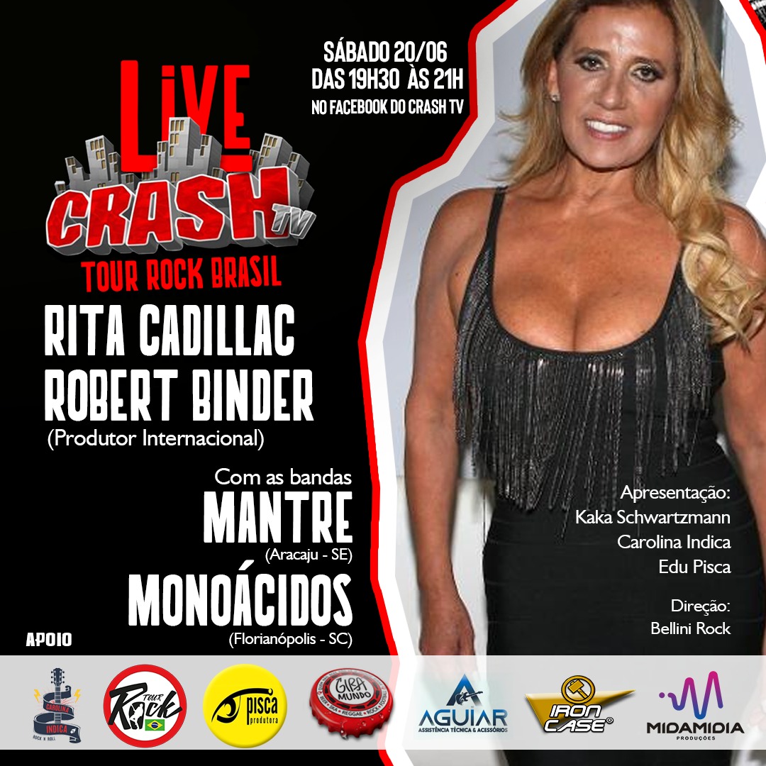 Neste sábado, 20/06, às 19:30h, pelo facebook do Crash TV, acontecerá uma live muito especial com a presença da atriz, bailarina e cantora Rita Cadillac e do produtor de bandas internacionais Robert Binder.
