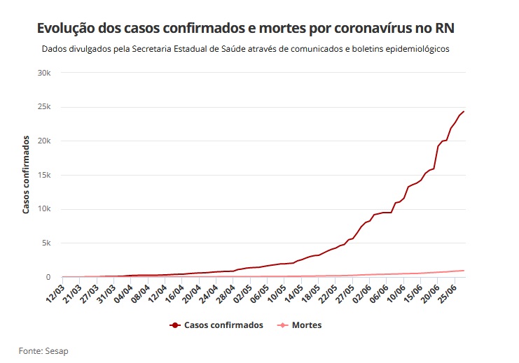 O Rio Grande do Norte tem 24.301 casos confirmados de Covid-19 e 937 pessoas mortas pela doença. Os números são os mais recentes sobre o avanço da pandemia no estado e foram divulgados neste domingo (28) pela Secretaria de Estado da Saúde Pública (Sesap).