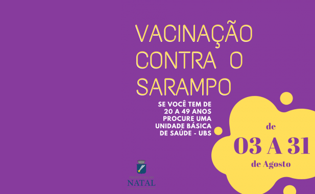 A Secretaria Municipal de Saúde de Natal (SMS/Natal) vai intensificar a imunização contra o sarampo para pessoas de 20 a 49 anos residentes no município no período de 03 a 31 de agosto. A medida é uma extensão da campanha nacional recomendada pelo Ministério da Saúde em todo o Brasil.