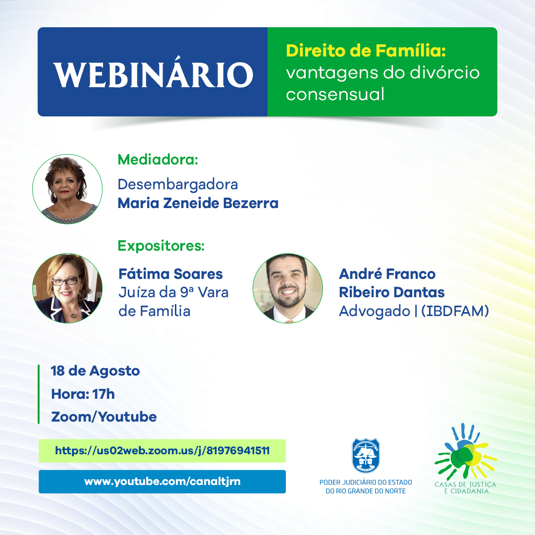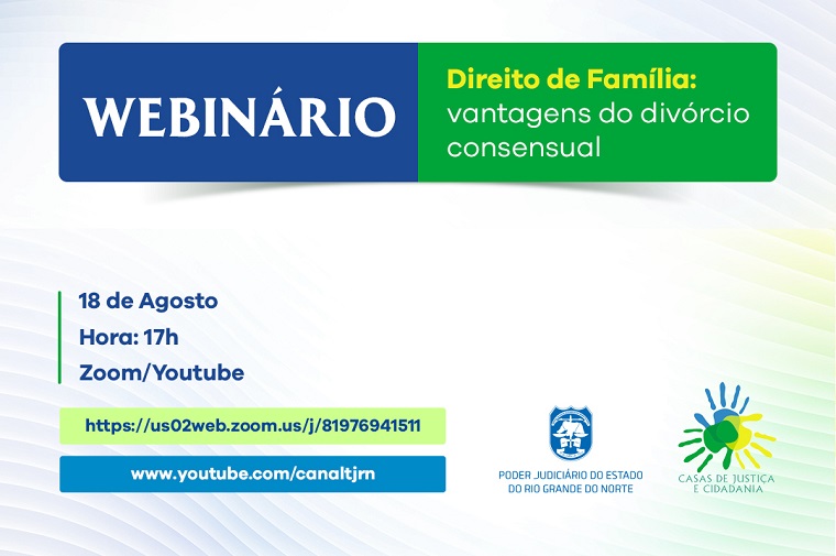 O Núcleo de Ações e Programas Socioambientais (NAPS) do Tribunal de Justiça do RN promove nesta terça-feira (18), às 17h, o webinário “Direito de Família: vantagens do divórcio consensual”, com transmissão ao vivo pelo canal do TJRN no YouTube.