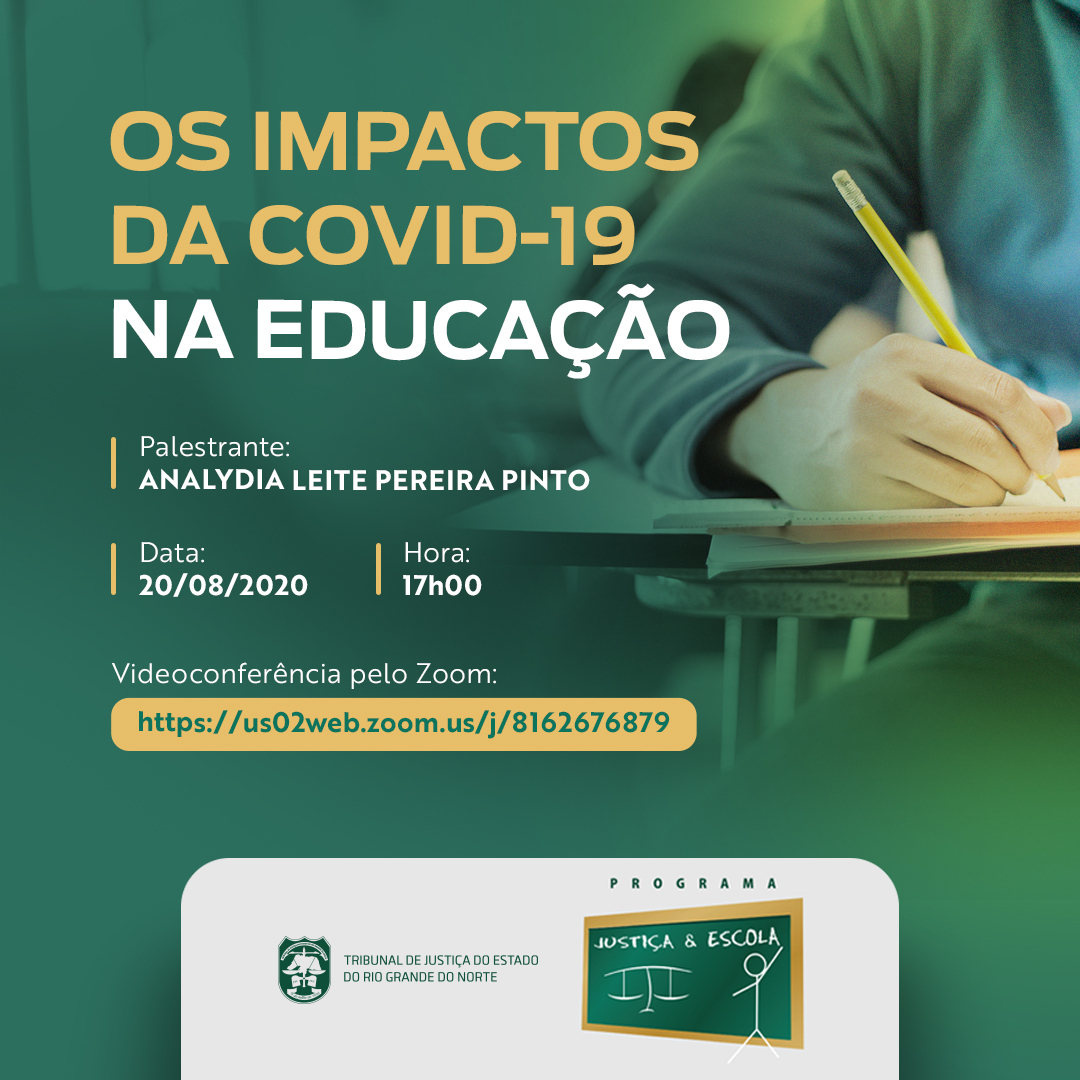 Na quinta-feira (20), também às 17h, o programa do NAPS “Justiça e Escola”, promove a palestra virtual “Os impactos da Covid-19 na Educação”, com a professora Analydia Leite Pereira Pinto. A palestra também será transmitida ao vivo pelo canal do TJRN no YouTube.