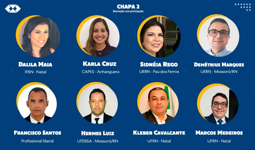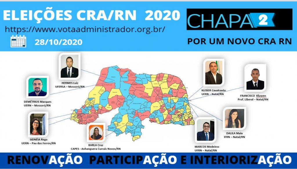 Com o slogan: SOMOS A CHAPA 2! Juntos! Todos por um novo CRA/RN, os administradores Kleber Cavalcante, Demétrius Marques, Marcos Medeiros, Sidnéia Rego, Karla Cruz, Dalila Maia, Francisco Kluwen e Hermes Luiz defendem a renovação e a maior participação dos administradores na Gestão do Conselho.