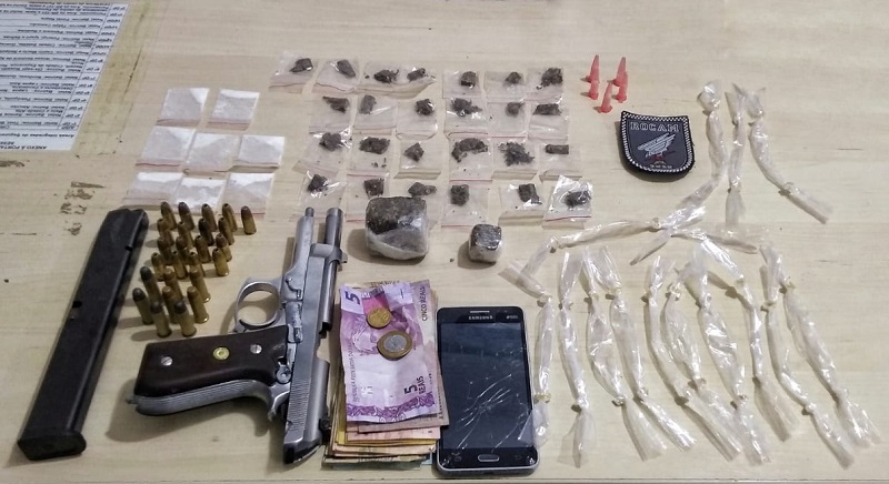 Os infratores estavam de posse de 25 porções menores e 02 maiores de maconha, 13 porções de cocaína, 29 porções de crack, 01 aparelho celular, R$ 946,00 em espécie, 01 arma de fogo, tipo pistola, calibre 9 mm, número de série TNL18674, com um carregador longo promag, além de 17 munições de calibre 9 mm e 08 munições de calibre 38.