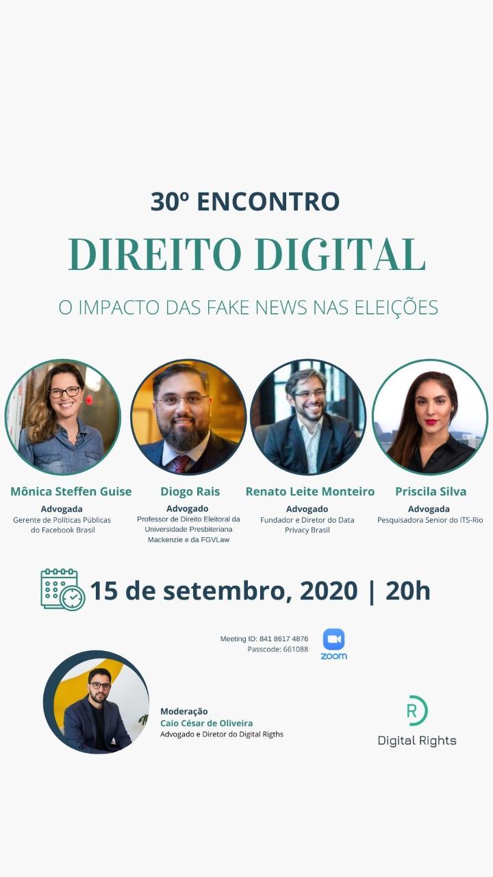 O 30º Encontro de Direito Digital, promovido pelo Portal Digital Rights, que terá como tema “O Impacto das Fake News nas Eleições, acontecerá amanhã, terça-feira 15/09, às 20h via Zoom.