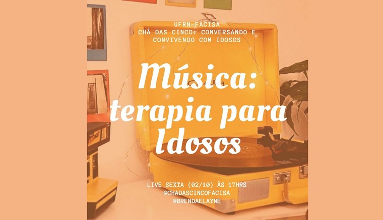 O Projeto Chá das Cinco, da Faculdade de Ciências do Trairi (Facisa) realiza nesta sexta-feira, 2 de outubro, encontro remoto com  o tema Música – terapia para idosos. A ideia é  abordar as muitas formas como a música pode se apresentar no dia-a-dia da pessoa idosa e os benefícios que pode propiciar.