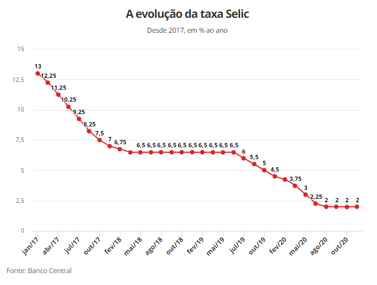 A previsão dos analistas consultados pelo relatório Focus, do Banco Central, é que a taxa básica de juros (Selic) encerre 2021 a 3% ao ano, acima dos 2% observados em 2020.
