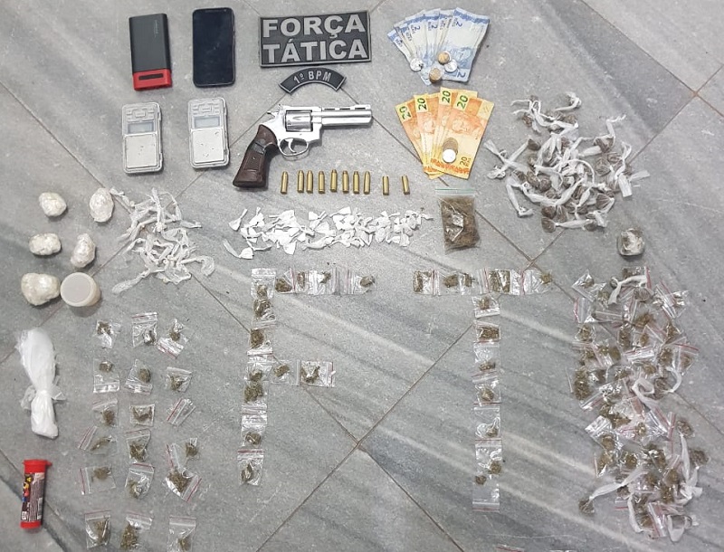 Em incursão na comunidade, mais precisamente na rua Ocidental de Baixo, os militares prenderam os dois homens, e com eles foi apreendido o seguinte material: 01 Revólver Cal.38 da marca Rossi com 06 munições intactas e 02 deflagradas, 183 porções de Maconha, 53 porções de Cocaína, 05 embalagens plásticas contendo dezenas de pedras de Crack, 29 pedras pequenas embaladas e 01 recipiente plástico contendo a mesma droga, 02 balanças de precisão, dezenas de sacos plásticos (usados para acondicionamento dos entorpecentes), 01 aparelho de telefone de celular, 01 bateria portátil e a quantia de R$ 121,00 em dinheiro fracionado.