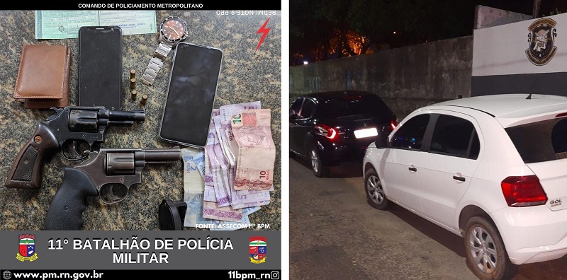 Alguns minutos depois, os Policiais Militares de Ceará-Mirim realizavam patrulhamento quando se depararam com o Gol sendo abastecido em um posto já em Ceará-Mirim. Ao abordar os integrantes do Gol, os PMs encontraram 02 revólveres calibre .38 municiados.