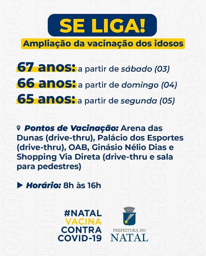 Com a chegada de novas vacinas neste fim de semana, a Prefeitura de Natal amplia a faixa etária de vacinação dos idosos. No sábado (3), começa o atendimento às pessoas com 67 anos ou mais; no domingo (4), com 66 anos ou mais; na próxima segunda-feira (5), podem se vacinar os idosos a partir dos 65 anos.