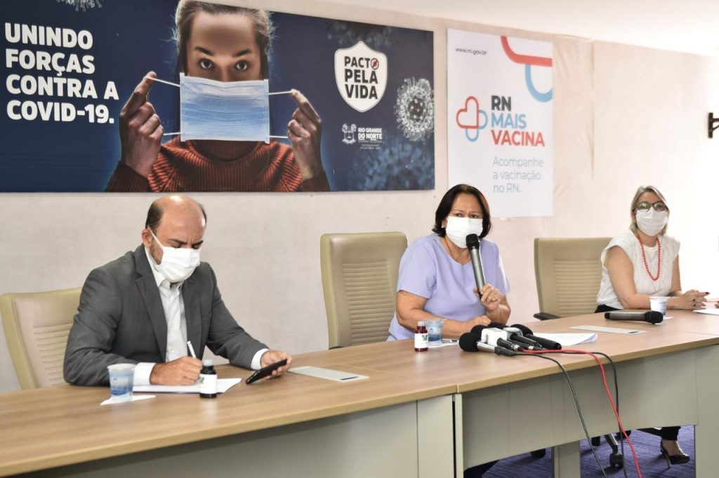 Acompanhada do vice-governador, Antenor Roberto, Fátima fez o anúncio do pedido durante coletiva de imprensa e explicou a necessidade e a urgência do pedido ao detalhar a atual situação dos municípios potiguares que estão com atraso na aplicação da segunda dose do imunizante.