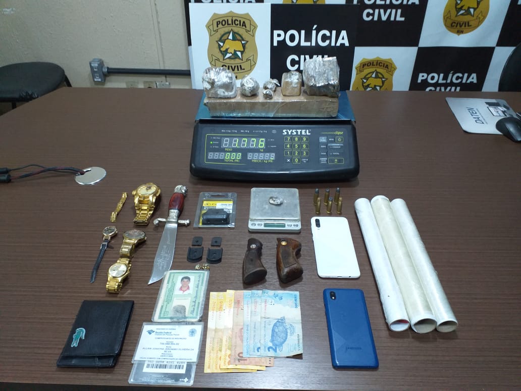 Durante a ação realizada nesta quarta-feira (12), foram localizados com os suspeitos: dois quilos de maconha, duas balanças de precisão, objetos para embrulho e fracionamento da droga, seis munições calibre 38 e diversos objetos de origem suspeita. Allain Jonatha foi autuado em flagrante pelos crimes de corrupção de menores, tráfico de drogas, associação para o tráfico de drogas, posse ilegal de munições e por integrar organização criminosa armada, com presença de adolescente. Em seguida, ele foi conduzido ao sistema prisional, onde ficará à disposição da Justiça. Já a adolescente, foi encaminhada para Centro de Atendimento Socioeducativo (CASEP).