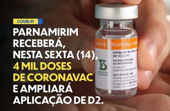 Parnamirim receberá nesta sexta-feira (14) 4 mil doses de CoronaVac, que serão usadas exclusivamente na aplicação da D2 de quem tomou a 1ª dose do imunizante até o dia 06/04.