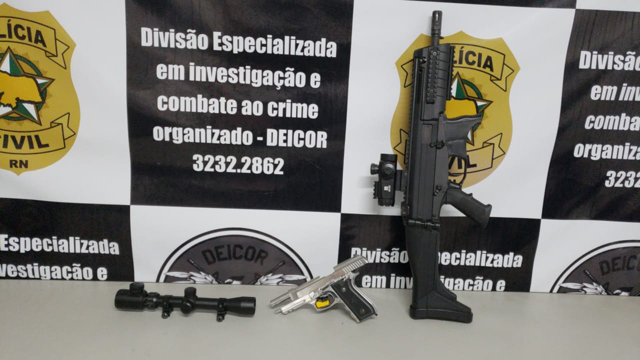 Policiais Civis da Divisão Especializada em Investigação e Combate ao Crime Organizado (DEICOR) apreenderam, nesta quinta-feira (13), duas armas de fogo, dando continuidade à Operação “O Senhor das Armas”. As diligências aconteceram em uma residência localizada no bairro Mirassol, em Natal, onde foram apreendidas uma submetralhadora calibre .40 e uma pistola 9mm, ambas pertencentes a Makson Felipe de Menezes Pereira, conhecido como “Playboy das Armas”.