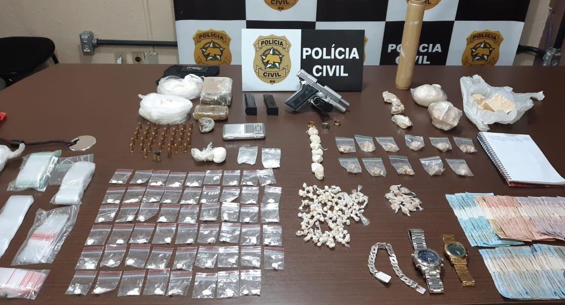 Eles foram localizados e presos no interior do imóvel onde residiam, no conjunto Aquarela, no bairro São José. Com o casal, foram encontradas grande quantidade e variedade de drogas, além de uma pistola, três carregadores e farta munição. Eles foram presos pela suspeita dos crimes de tráfico de drogas, associação para o tráfico e posse ilegal de arma de fogo e munições.