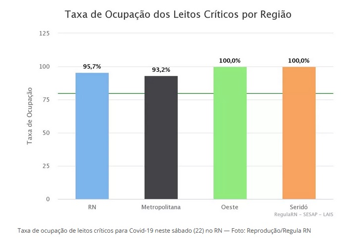 As regiões Oeste e Seridó potiguares estão com 100% dos leitos críticos para Covid-19, na manhã deste sábado (22), segundo dados do Regula RN, usado na administração da assistência na rede pública de saúde.