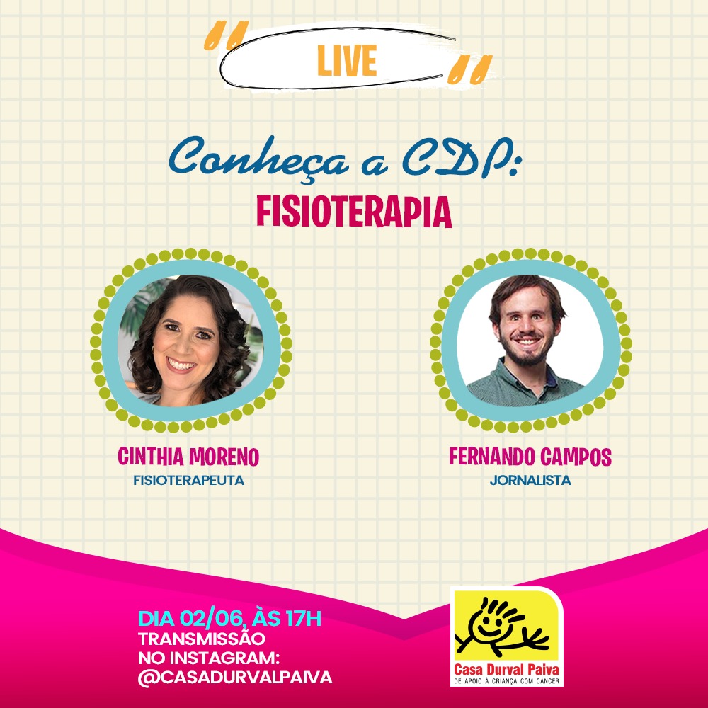 Integrando a equipe multidisciplinar da Casa Durval Paiva, realizará uma live para apresentar um pouco mais sobre o setor de fisioterapia. A proposta desse serviço é atender as crianças e adolescentes com câncer e doenças hematológicas crônicas, que tenham comprometimentos musculoesqueléticos e sequelas funcionais, necessitando de algum tipo de reabilitação física.