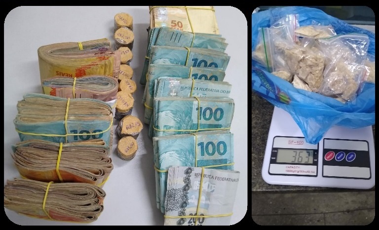 Na continuação das diligências, no bairro Golandim, cidade de São Gonçalo do Amarante, na Grande Natal, os policiais militares encontraram em um outro imóvel utilizado por foragidos da justiça um tablete de cocaína, um tablete de crack, além de várias porções embaladas prontas para venda, balanças de precisão, utensílios utilizados no tráfico e ainda apreenderam R$ 10.276,00 em dinheiro fracionado.