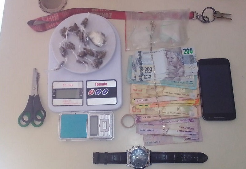 Por volta das 14h50, a equipe de policiais se encontrava em patrulhamento pela rua Mar do Leste, quando visualizou a dupla, que empreendeu fuga, pulando muro das residências, ao avistar a viatura. Foi feito o acompanhamento por parte dos militares que logrou êxito ao capturar os dois suspeitos e com eles foi apreendido drogas, balança de precisão, sacos plásticos, tesoura e dinheiro fracionado. Material que configura o crime de tráfico de drogas.
