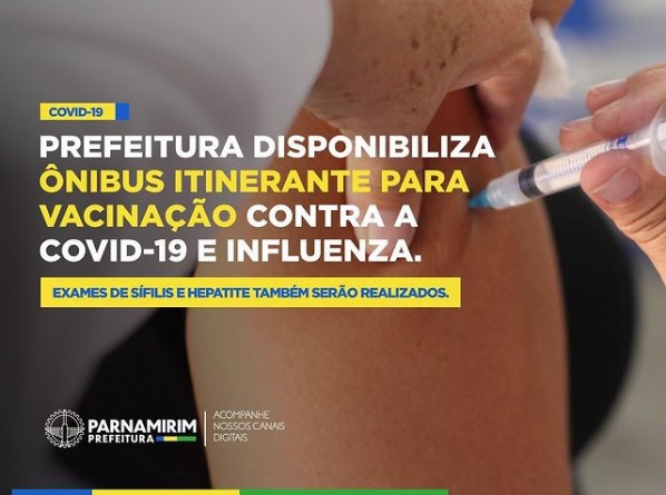 Em parceria com a Cruz Vermelha, a Prefeitura de Parnamirim está disponibilizando um ônibus itinerante que irá realizar a vacinação contra a Covid-19 (para os grupos já abertos) e Influenza (HIN1) para toda a população em diferentes pontos da cidade. A cada dia, o veículo estará em uma área diferente do município para melhor atender a população.