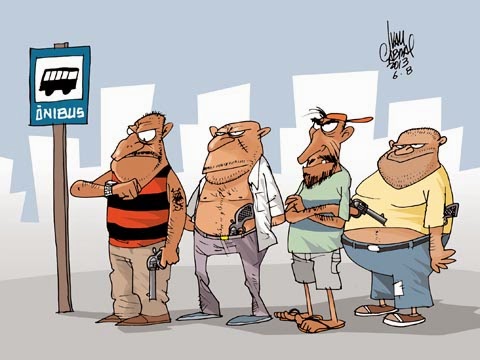 Mas naquele mesmo rolar de dados, que quase nunca dá o número que a gente espera, havia uma viatura da polícia numa das ruas transversais. Os policiais conversavam despreocupadamente quando perceberam os sinais do motorista do ônibus e das cabeças e braços – agora fora da janela fazendo gestos desesperados,mesmo na iminência de levar um teco no meio dos olhos – e saíram dali cantando pneu com armas em punho, dando o retorno para pegar os boys na rua paralela.
