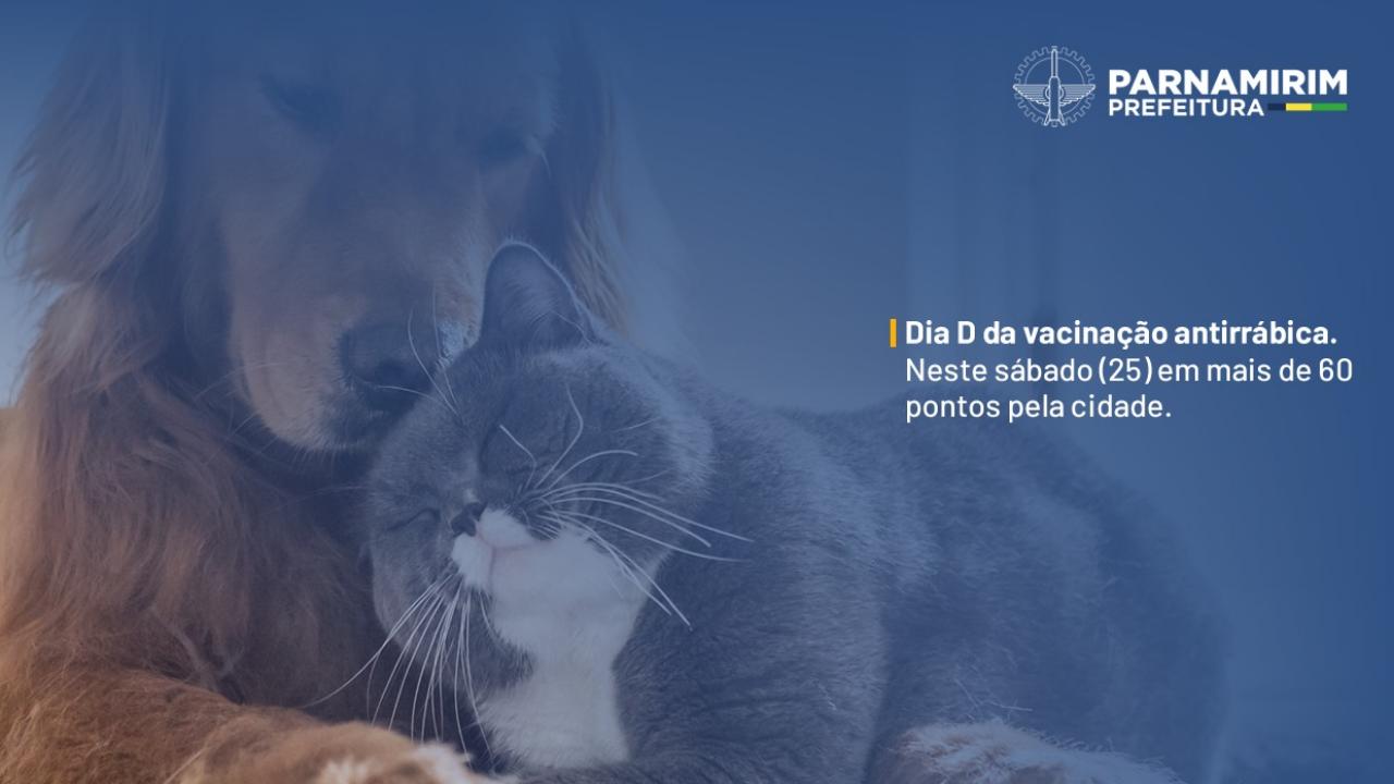 Neste sábado (25) acontece o Dia D da vacinação antirrábica. Não deixe de levar o seu cãozinho ou gatinho de estimação para receber o imunizante e ficar protegido. A ação é realizada pela Prefeitura de Parnamirim, por meio da Unidade de Vigilância de Zoonoses, órgão ligado à Secretaria Municipal de Saúde (Sesad) e contará com 60 pontos espalhados pelos pela cidade.