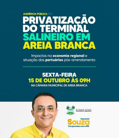 O deputado Souza (PSB), durante a Sessão Plenária desta quinta-feira (14) na Assembleia Legislativa do Rio Grande do Norte, no horário destinado aos deputados convocou os seus conterrâneos a participarem da audiência pública que acontece nesta sexta-feira (15), às 9h, na Câmara Municipal de Areia Branca, para debater a privatização do Terminal Salineiro da cidade, o chamado Porto Ilha, e principalmente o destino dos trabalhadores portuários após seu arrendamento.