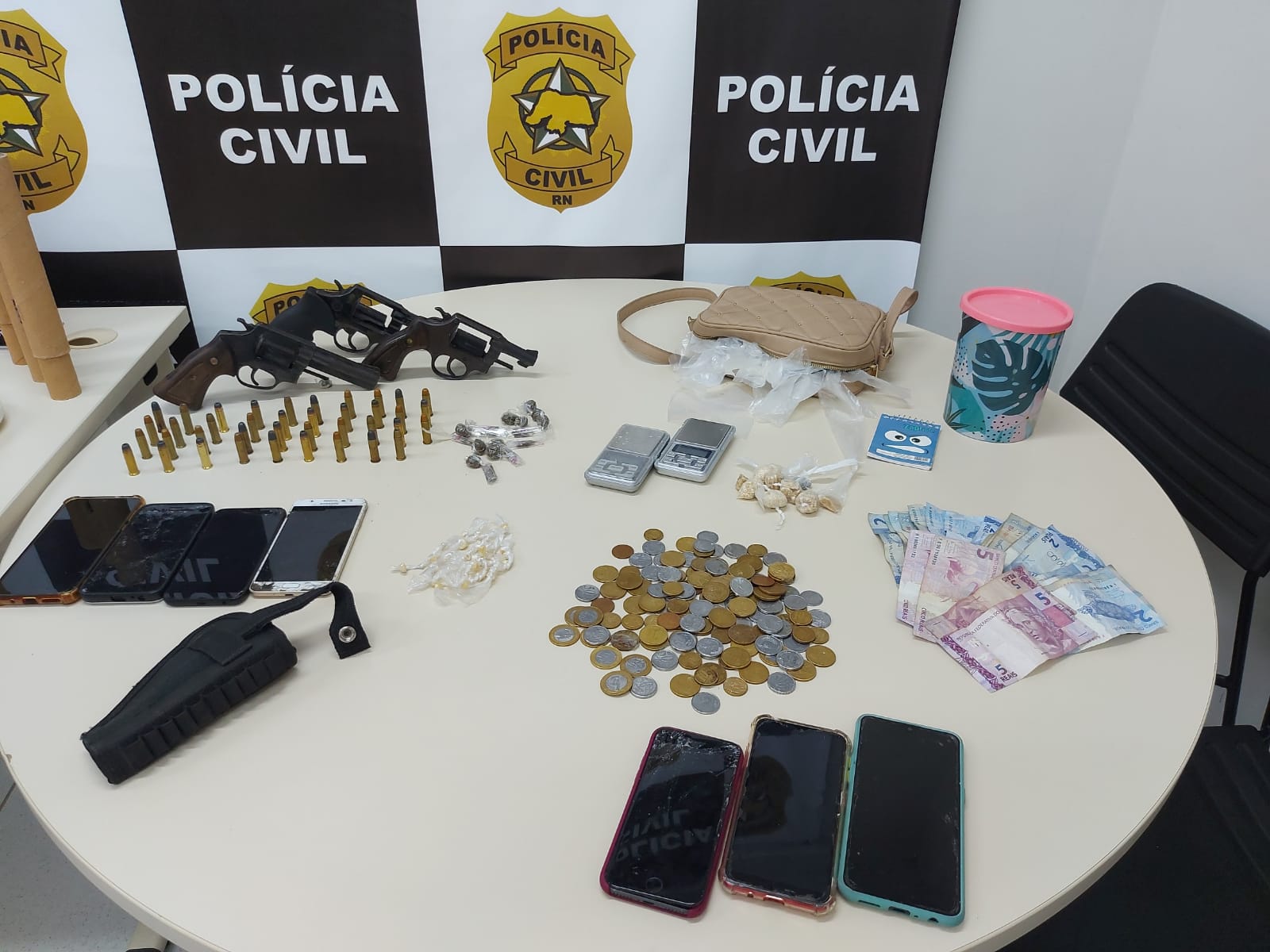 No local, foram apreendidos aparelhos celulares, diversos sacos plásticos usados para acondicionar drogas, oitos porções médias de crack, uma porção de maconha, moedas, dinheiro fracionando em notas de R$ 2,00 e R$ 5,00, além um caderno de anotações possivelmente relacionadas à contabilidade de tráfico de drogas.