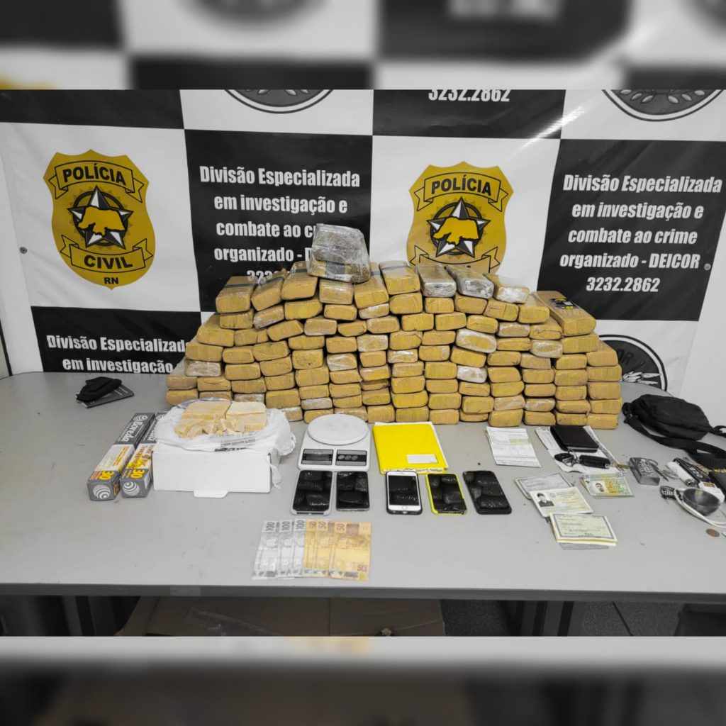 Policiais civis da Divisão Especializada em Investigação e Combate ao Crime Organizado (DEICOR) prenderam, nesta segunda-feira (06), quatros homens e apreenderam 100 kg de drogas, na zona sul de Natal. Durante a ação, foram detidos: Jeandson Lucas de Araújo, conhecido como “Pateta”, 29 anos; Jeferson Rai Dantas, 26 anos; Alysson Alexandre Cunha de Farias, 23 anos e Jeferson Bruno da Silva Costa, 25 anos.