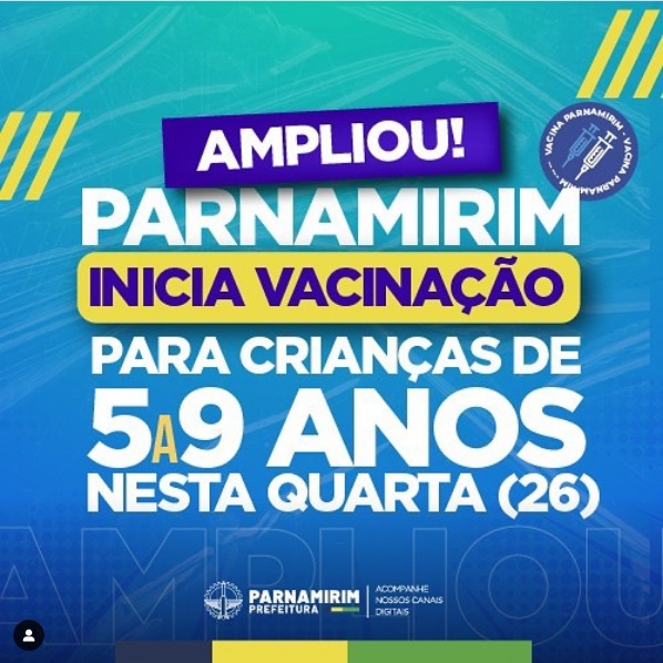 A Prefeitura de Parnamirim inicia hoje a vacinação de crianças de 5 a 9 anos de idade. A documentação necessária para que os pais vacinem seus filhos é: documento oficial com foto ou certidão de nascimento da criança, cadastro no RN+Vacina e na ausência dos pais, declaração de autorização, disponível em nosso site.