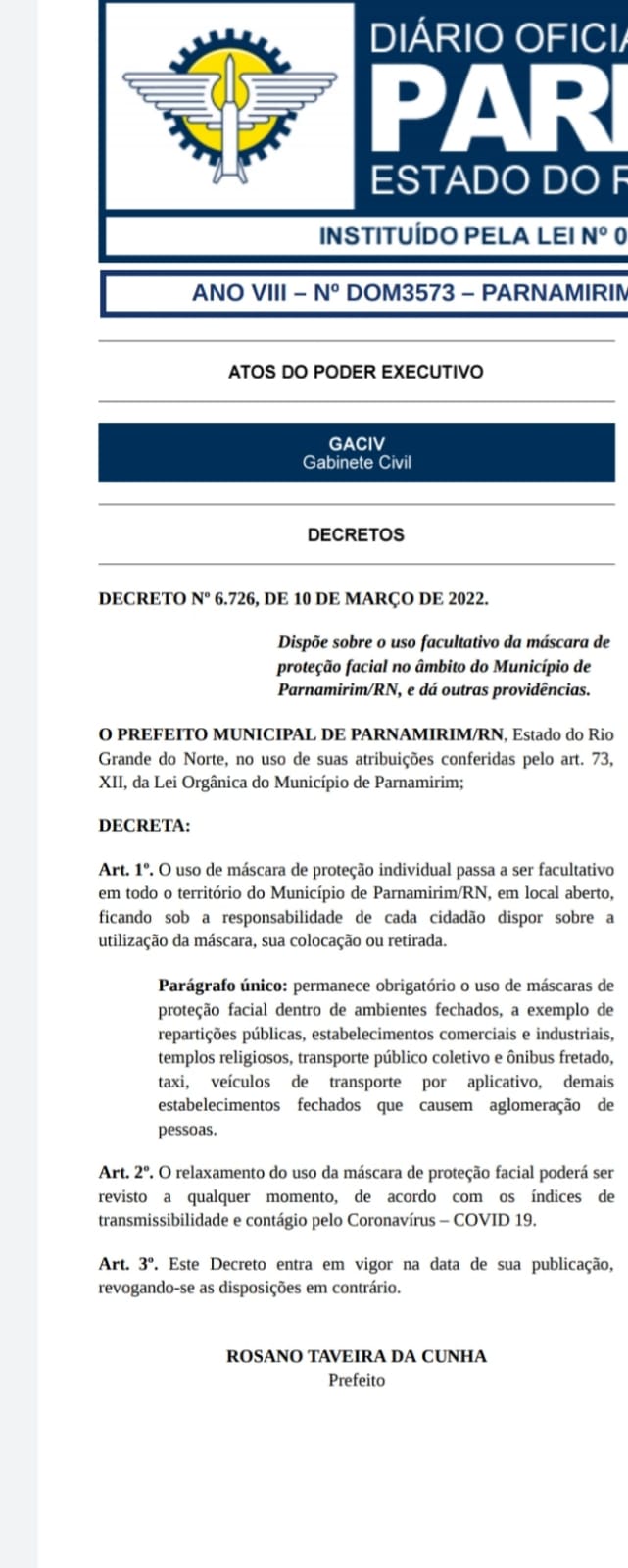 A Prefeitura de Parnamirim publicou o Decreto nº 6.276 de 10 de março de 2022 tornando facultativo o uso de máscaras em local aberto. Porém o decreto mantém a obrigatoriedade do uso da máscara em locais fechados. Repartições, comércios e indústrias devem continuar exigindo o uso da máscara.