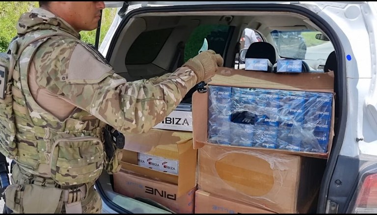 Durante ronda, os policiais visualizaram um veículo Spin de cor branca em atitude suspeita e deram ordem de parada. O condutor não portava documentos e demonstrou bastante nervosismo, o que levou os policiais a realizarem uma busca pessoal e veicular. No banco traseiro e porta-malas do veículo foram encontrados 2,5 mil maços de cigarro de origem estrangeira, carga esta avaliada em 9 mil reais.