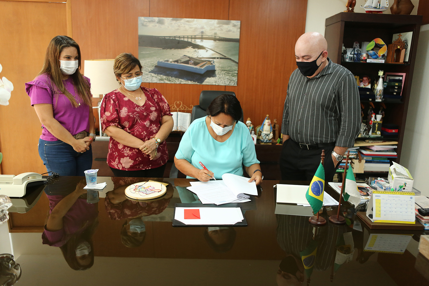 “Alegria nossa porque eu tinha dito que até 10 de abril o governo iria fazer a sua parte no acordo e aqui está. Sigamos em frente para que a obra tenha início o mais rápido possível”, reforçou Fátima, que estava acompanhada da diretora técnica do DER, Natércia Nunes, do secretário do Desenvolvimento Rural e da Agricultura Familiar (Sedraf), Alexandre Lima, e da secretária adjunta do Gabinete Civil, Socorro Batista.