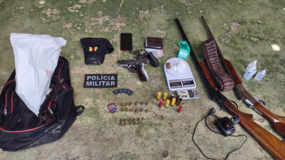 Os policiais encontraram duas espingardas, uma pistola, um revólver calibre .32, munições diversas, drogas e uma balança de precisão. A mulher e todo o material apreendido foram conduzidos e apresentados na delegacia de Polícia Civil, onde foi realizado o procedimento legal cabível.