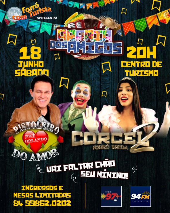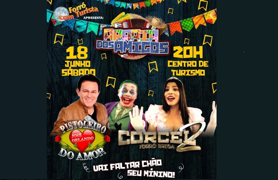 Arraiá dos amigos, o arraiá da capitá! Sábado dia 18 de Junho às 20h no Centro de Turismo com José Orlando, o pistoleiro do amor e o forró brega sensação do momento Corcel 2, juntos pela primeira vez!