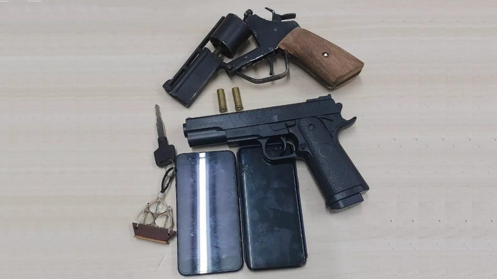 Com os suspeitos, foram apreendidos celulares roubados, a motocicleta, que também era roubada, uma arma de fogo e um simulacro – objeto que simula uma arma.