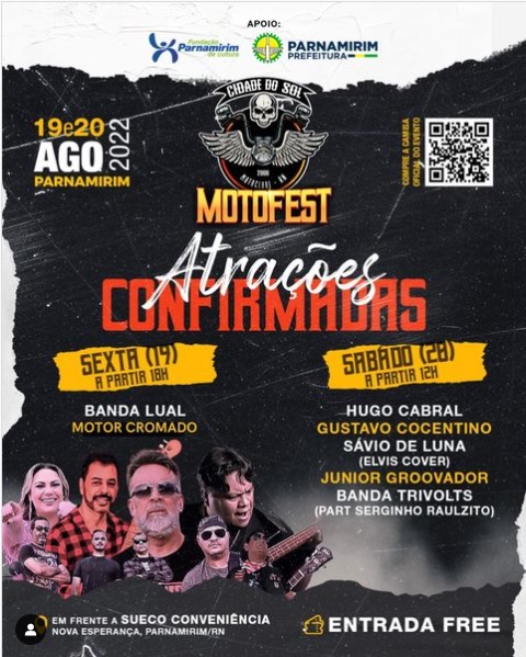 O 1º Cidade do Sol Motofest acontece nos dias 19 e 20 de agosto de 2022 no bairro de Nova Esperança em Parnamirim. Um evento não só para os amantes das duas rodas, mas para toda a família. É GRATUITO e aberto ao público com o apoio da Fundação Parnamirim de Cultura.